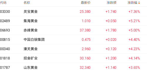 财联社3月25日讯(编辑 胡家荣)港股黄金板块表现强劲,多只龙头股显著上涨。截至发稿,灵宝黄金(03333.HK)涨7.36%、集海黄金(02489.HK)涨5.21%、赤峰黄金(06693.HK)涨5%、潼关黄金(00340.HK)涨4.23%。