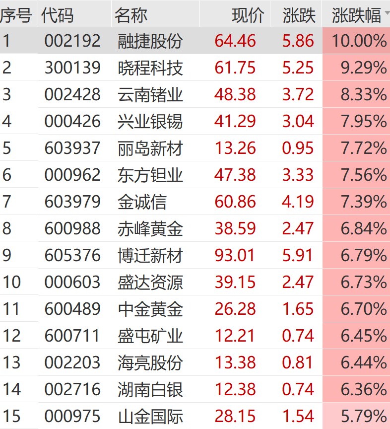 个股方面,融捷股份涨停,晓程科技、兴业银锡、赤峰黄金、盛达资源、中金黄金等纷纷大涨。