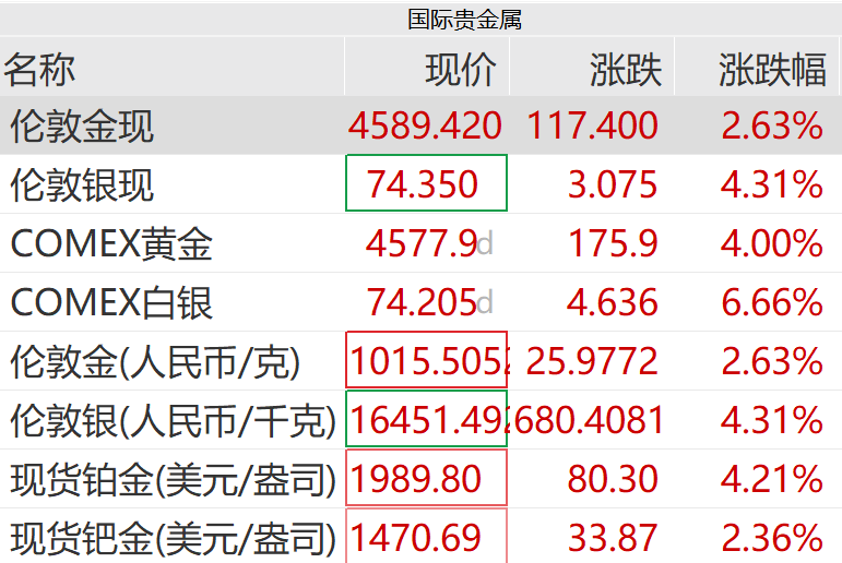 3月25日上午,国际贵金属现货、期货价格持续走强。截至发稿,现货黄金涨超2.5%,现货白银涨超4%;COMEX黄金涨4%,白银涨超6%;铂金、钯金亦有明显涨幅。